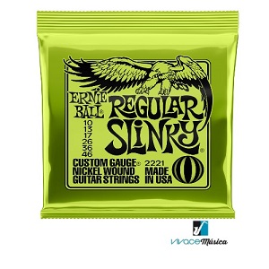 Les cordes de guitarra elèctrica Ernie Ball Regular Slinky són les més venudes i avalades per milers de guitarristes a tot el món. Totes les cordes d’ Ernie Ball estan fabricades amb precisió, utilitzant els estàndards més alts de qualitat i les especificacions més exigents per assegurar consistència, rendiment òptim i llarga vida útil. Calibres .010 (Mi, 1a corda), .013 (Si, 2a corda), .017 (Sol, 3a corda), .026 (Re, 4a corda), .036 (La, 5a corda), .046 (Mi, 6a corda).